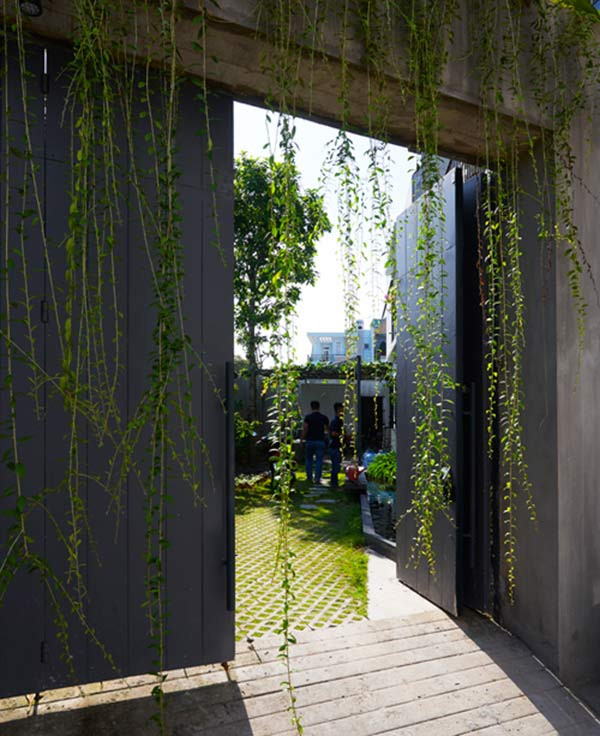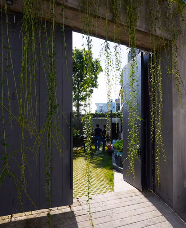 Lối cổng vào kín đáo, có gắn thiết bị chống trộm và camera an ninh, được làm mềm mại nhờ rèm cây buông rủ.