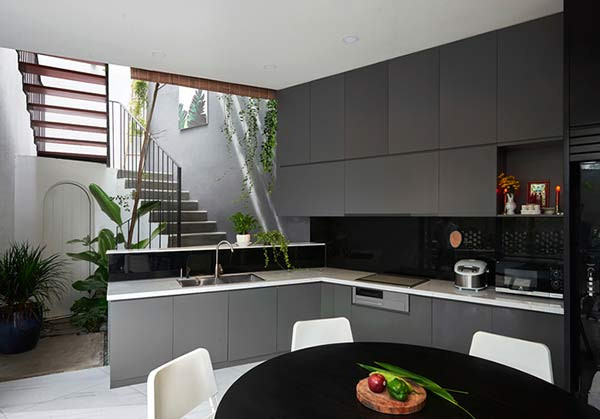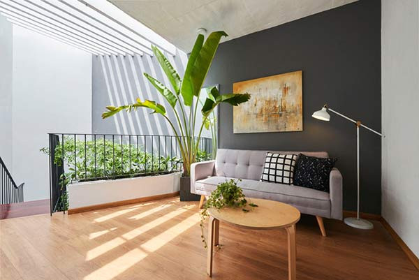 Gia chủ dành nhiều đất cho sân vườn, giếng trời nên trong nhà luôn ngập tràn ánh sáng, thông thoáng tự nhiên, góc nào cũng nhìn thấy cây xanh.