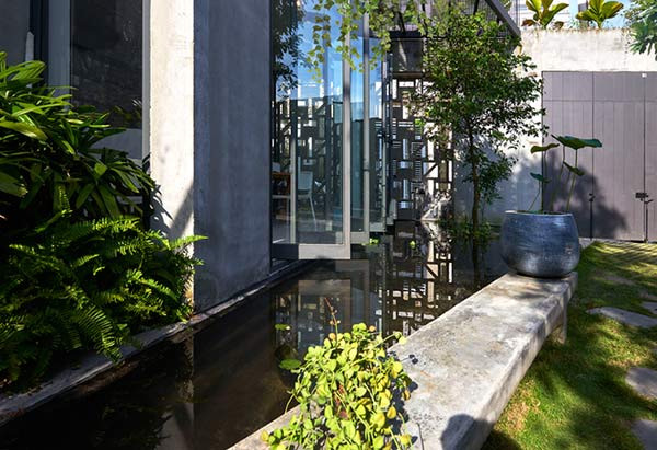 Gia chủ dành 110 m2 (hơn nửa diện tích đất) để làm lối vào văn phòng, để xe, hồ nước, vườn rau, chỗ sinh hoạt ngoài trời.