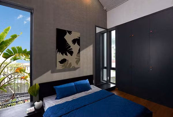 Tầng 2 có diện tích 80 m2 với không gian sinh hoạt chung, phòng ngủ, WC, phòng làm việc, ban công.