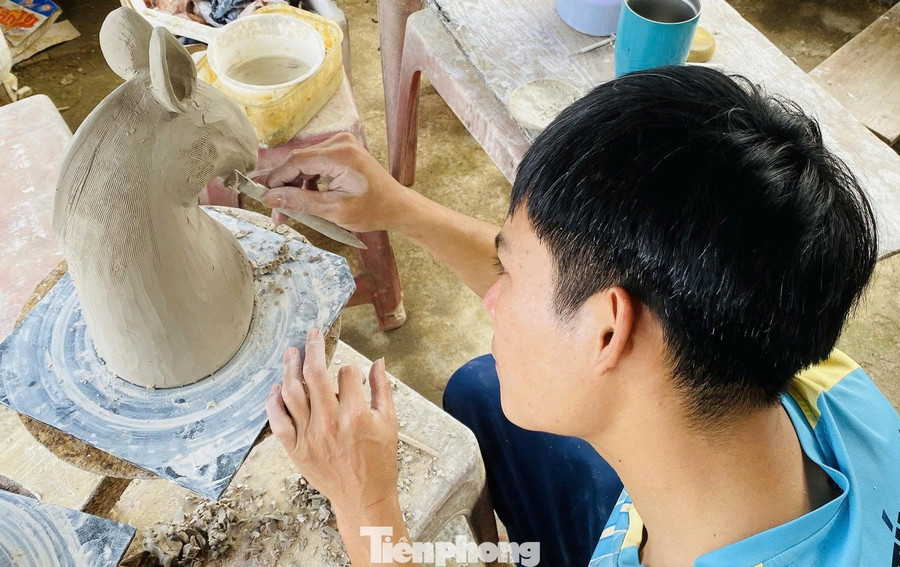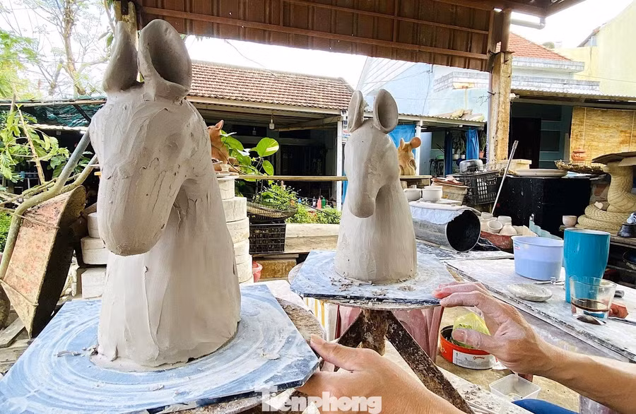 Tại cơ sở gốm kế bên, anh Nguyễn Văn Hoàng đang trau chuốt cặp linh vật Tết Nguyên đán Bính Ngọ 2026. Anh là một trong những nghệ nhân được tin tưởng đặt hàng cặp linh vật biểu tượng của năm mới hằng năm. Năm nay, anh Hoàng nhận làm 2 chú ngựa bằng gốm để phục vụ cho việc trưng bày trên tuyến đường dẫn vào làng trong dịp Tết Nguyên đán sắp tới.