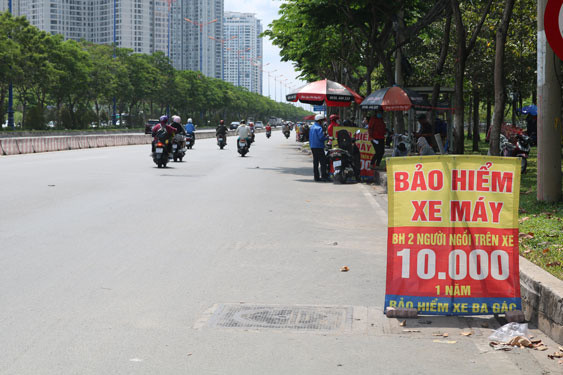 Trên xa lộ Hà Nội, đoạn vừa đổ dốc cầu Sài Gòn theo hướng về quận Thủ Đức (phường An Phú, quận 2), đoạn đường chưa đầy 300 m nhưng dày đặc điểm bán bảo hiểm xe máy bên lề đường. Hầu hết các điểm bán bảo hiểm đều treo bảng với dòng chữ lớn quảng cáo bán bảo hiểm xe máy 2 người ngồi với giá rất rẻ, chỉ 10.000 đồng/năm, thậm chí có cả bảo hiểm cho xe ba gác. Một người bán cho biết các công ty bảo hiểm đưa giá 55.000 - 66.000 đồng/năm với loại bảo hiểm thuộc trách nhiệm dân sự bắt buộc, nếu chọn thời hạn 2 năm là 85.000 đồng; còn bảo hiểm tự nguyện dành cho người ngồi trên xe, tại quầy bán với giá 10.000 đồng/năm và 15.000 đồng/2 năm.