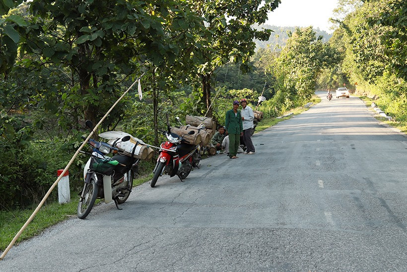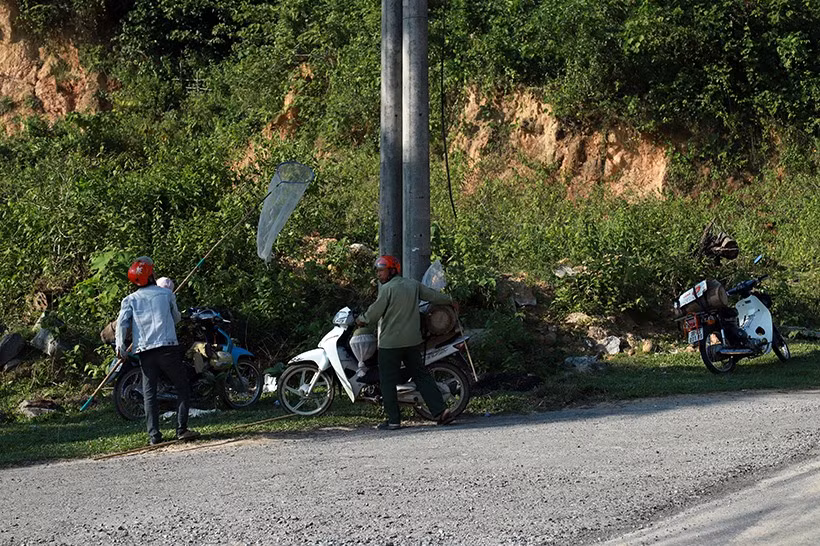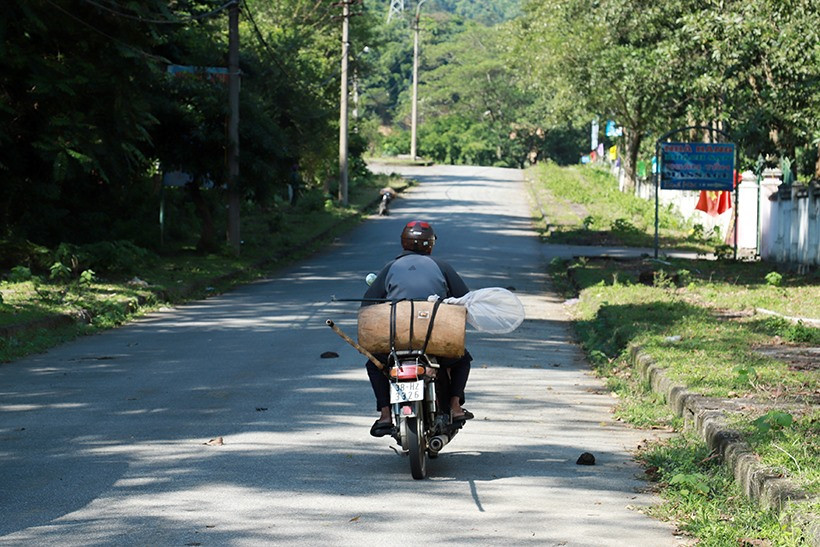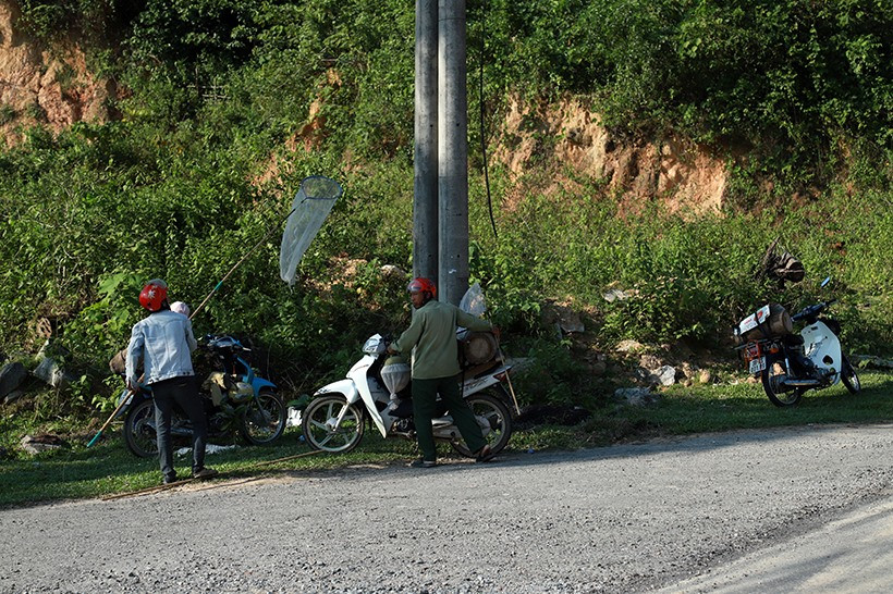 Sau hơn 1h chạy máy xe ngược ngàn, tôi cùng nhóm “thợ săn” ong “hạ trại” tại đỉnh Cua Tròn (khu vực khe Nước Sốt) thuộc huyện miền núi Hương Sơn (Hà Tĩnh), nơi sát bìa rừng và thường có nhiều ong di cư để bắt đầu công việc săn ong. Lúc này đã tầm 8h, tốp “thợ săn” chia nhau tỏa ra từng nhóm 2-3 người, căng tai, dõi mắt để nghe tiếng bay vo vo của ong sứ.