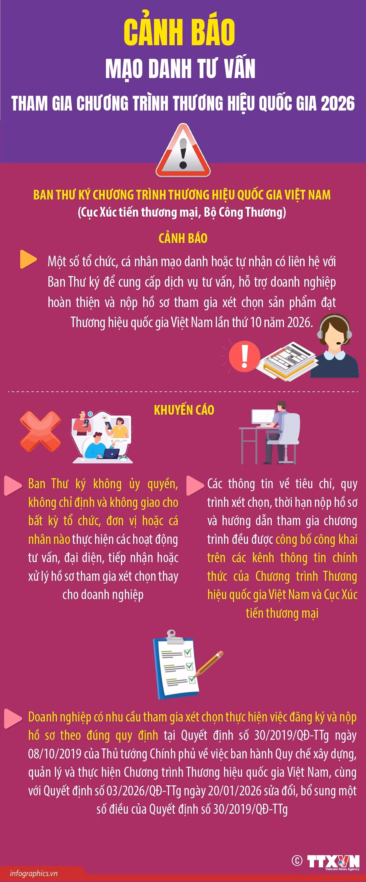 Ban Thư ký Chương trình Thương hiệu quốc gia Việt Nam khẳng định không ủy quyền, không chỉ định và không giao cho bất kỳ tổ chức, đơn vị hoặc cá nhân nào thực hiện các hoạt động tư vấn, đại diện, tiếp nhận hoặc xử lý hồ sơ tham gia xét chọn thay cho doanh nghiệp.