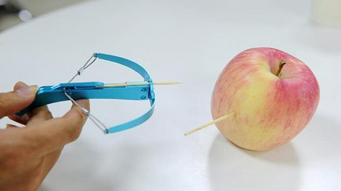 | Khi lấy kim hay đinh thay tăm, nỏ có thể bắn xuyên cả kính - Ảnh: AFP |
