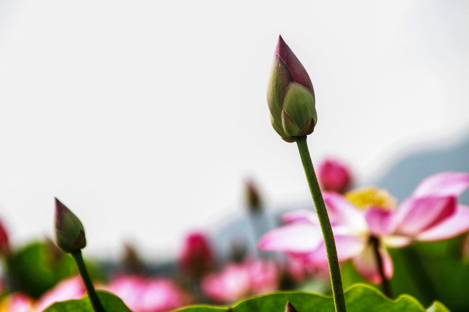 Buổi sáng là thời điểm thích hợp để ngắm và chụp ảnh hoa. Gió thổi nhẹ, chao lúa, làm rung những bông sen đang nở bung tạo cho du khách cảm giác an bình.