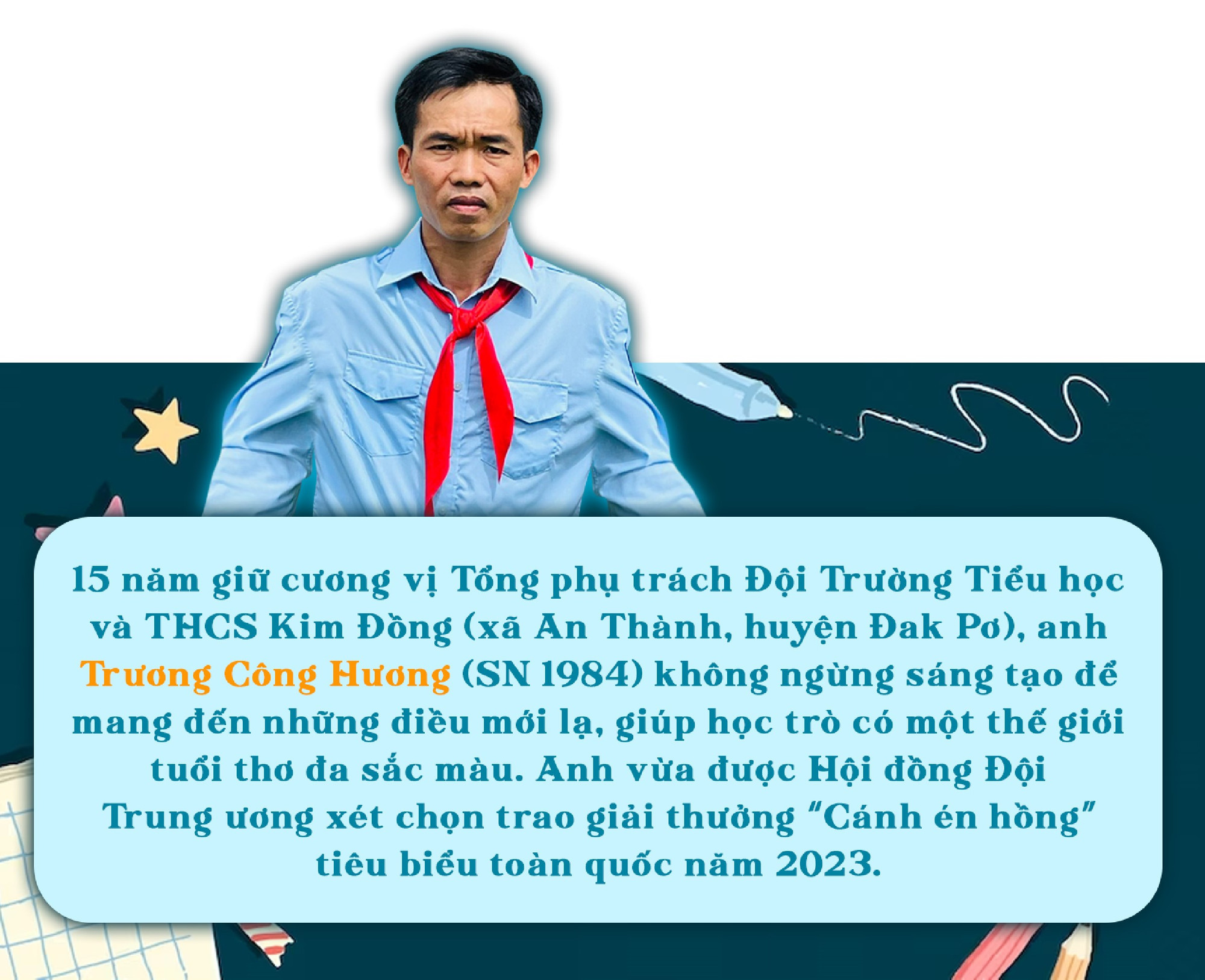 Trò chuyện cùng P.V, anh Trần Vi Tình-Bí thư Huyện Đoàn Đak Pơ-khẳng định: “Anh Trương Công Hương có nhiều kinh nghiệm trong công tác Đội, tích cực tham gia các trại huấn luyện Kim Đồng, các chương trình tập huấn do Hội đồng Đội các cấp tổ chức để nâng cao kỹ năng, nghiệp vụ chuyên môn. Tinh thần ham học hỏi, hết lòng vì học sinh của anh đã giúp phong trào của Liên Đội Trường Tiểu học và THCS Kim Đồng luôn nằm trong tốp đầu của huyện”.
