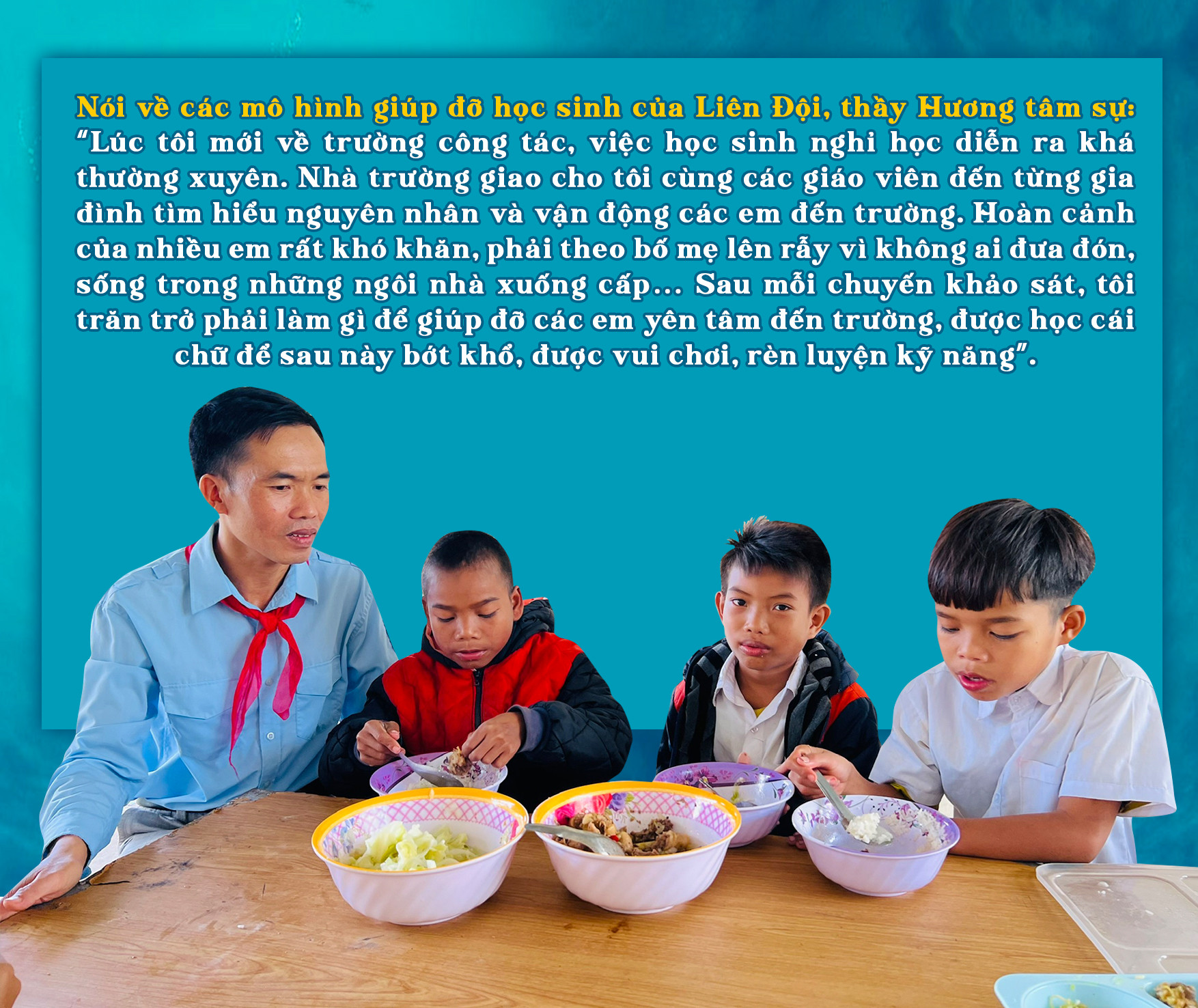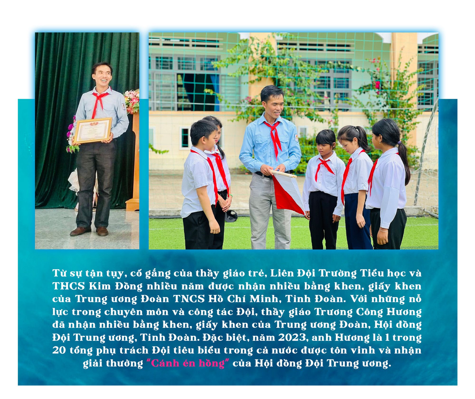 Bên cạnh đó, Liên Đội Trường Tiểu học và THCS Kim Đồng còn triển khai mô hình “Vườn rau em chăm”. Các chi đội thay nhau chăm sóc để có rau sạch trong bữa ăn bán trú của trường, còn dư thì bán cho thầy-cô giáo để gây quỹ giúp bạn đến trường. Bằng mối quan hệ sẵn có, thầy Hương đã kết nối với các Mạnh Thường Quân hỗ trợ gạo, sinh kế, quần áo, đồ dùng học tập… cho các em học sinh. Em Đinh Thị Chăng (lớp 6B) chia sẻ: “Thầy Hương rất gần gũi, thường xuyên tặng sách vở, áo quần và động viên em trong học tập. Em rất yêu quý thầy và hứa cố gắng học tập thật tốt”.