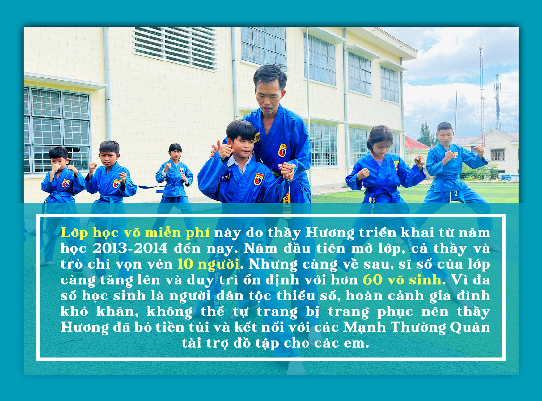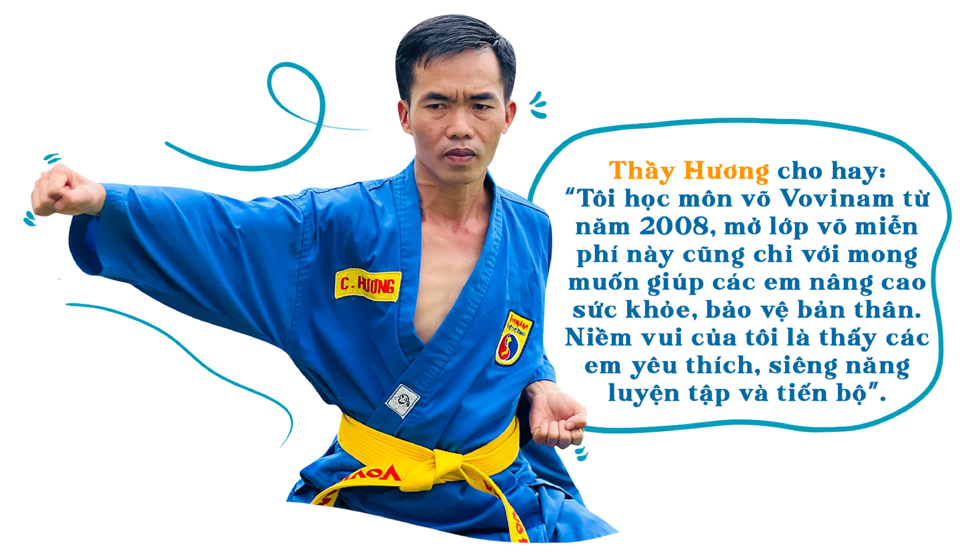 9 năm qua, lớp học võ miễn phí luôn rộn rã tiếng cười, được đông đảo phụ huynh hết lòng ủng hộ. Sau những giờ học căng thẳng, các em học sinh lại được thầy Hương ân cần dạy võ miễn phí. Em Đinh Gia Nguyên (lớp 7A) bày tỏ: “Em rất thích học võ để rèn luyện sức khỏe và sự kiên nhẫn. Chúng em theo học lớp võ của thầy Hương rất đều đặn”.
