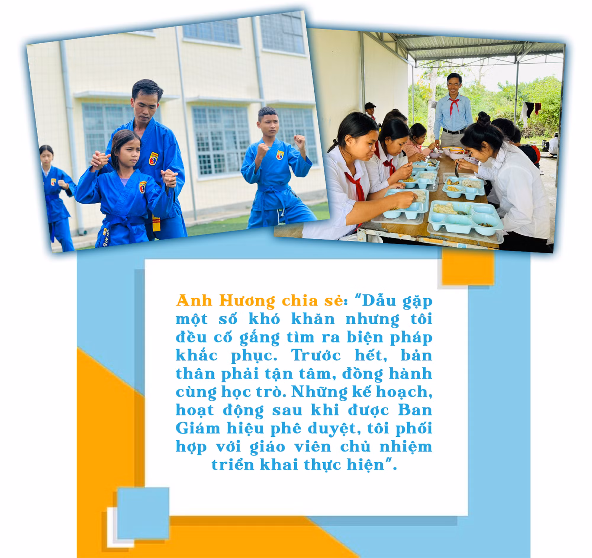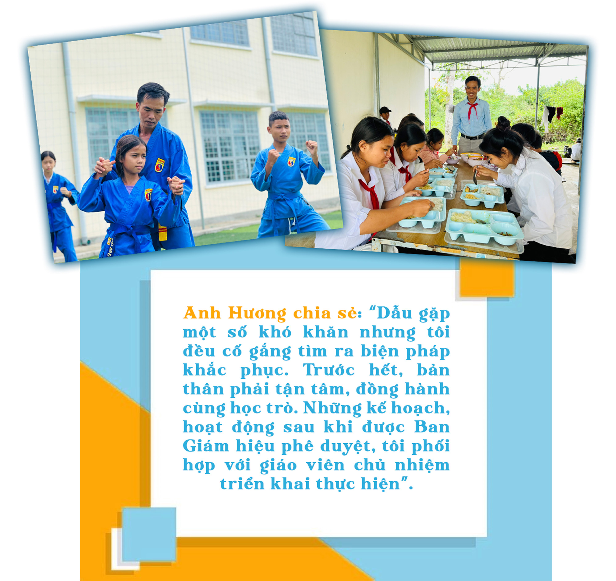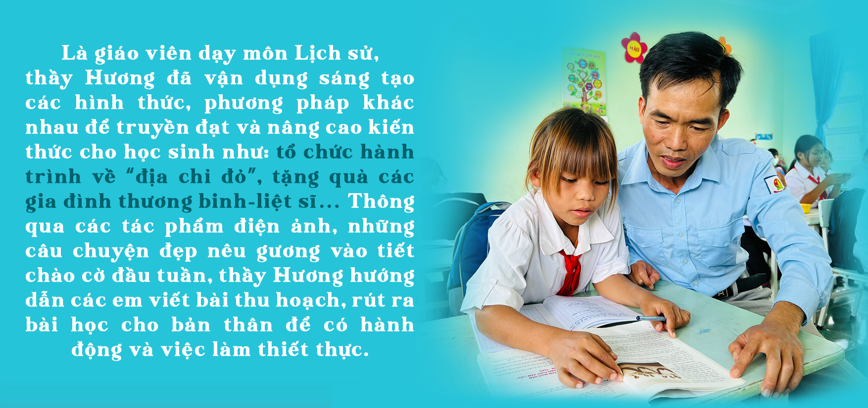 Trường Tiểu học và THCS Kim Đồng có 452 học sinh, hơn 89% là học sinh dân tộc thiểu số. Thông thường, các em học sinh dân tộc thiểu số hay nhút nhát. Vì vậy, anh Hương thường thông qua trò chơi, các hoạt động tập thể để giúp các em mạnh dạn, tự tin hơn. Những buổi sinh hoạt Đội không rập khuôn, khô khan theo kiểu báo cáo, phát biểu mà đổi mới hình thức tổ chức thông qua các hoạt động ngoại khóa, trải nghiệm gắn với chủ đề của tháng. Sự tận tâm của thầy Hương làm cho các em đội viên thi đua sôi nổi với những hoạt động tập thể. Em Nông Nguyễn Diệu Thảo-Lớp trưởng lớp 5B-cho biết: “Thông qua các hoạt động, phong trào Đội, các bạn có sân chơi lành mạnh, bổ ích. Em cũng có cơ hội thể hiện khả năng của bản thân, tự tin và mạnh dạn trong điều hành các hoạt động tập thể”.
