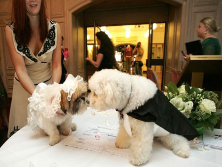 Hai chú chó Muffin và Timmy trong đám cưới của mình, đánh dấu bằng một nụ hôn của loài cún.