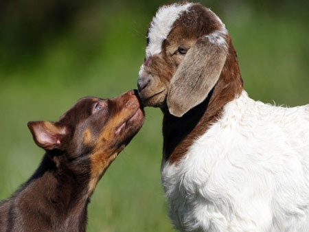 Chú cún này mới 5 tuần tuổi nhưng có tham vọng “môi chạm môi” với nàng dê 1 tuần tuổi “chân dài” hơn cả mình. Ảnh chụp tại Úc.