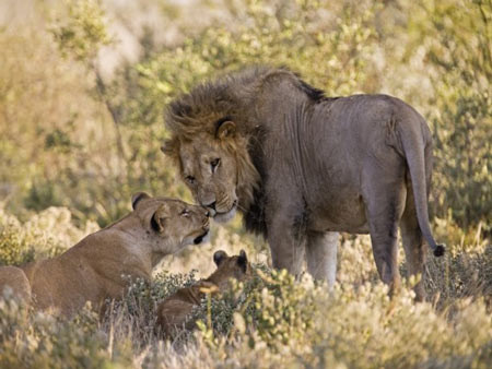 Gia đình sư tử trông thực sự hạnh phúc. Sư tử bố và sư tử mẹ trao nhau nụ hôn thừa lúc sư tử con đang lơ đãng.