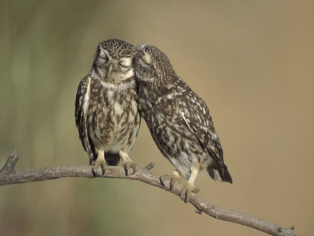 Cặp chim cú đang gần gũi trên một cành cây ở Tây Ban Nha.