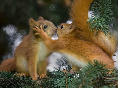 Đôi sóc ẩn mình sau bụi cây “tâm sự”. Thật đáng yêu khi chúng thậm chí còn biết đưa tay lên ôm lấy khuôn mặt bạn tình lúc “khóa môi”.