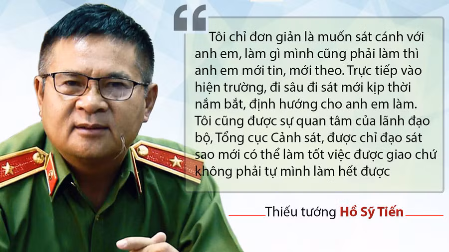 “Anh em chiến đấu hết mình, hi sinh tất cả cho công việc là trách nhiệm thôi. Nhưng cũng phải nói thật, ông Tiến (thiếu tướng Hồ Sỹ Tiến) lúc nào cũng vào tận hiện trường, dù là núi cao, rừng sâu, trèo đèo, lội suối, thức cả đêm trắng để lần từng dấu vết, lắng nghe từng ý kiến anh em, chỉ đạo từng li từng tí, ai mà dám lơ là.