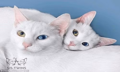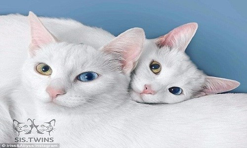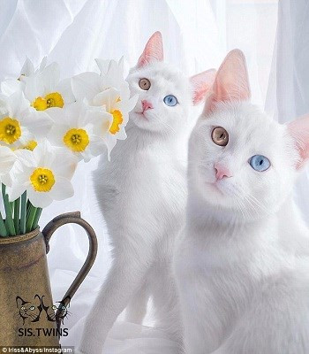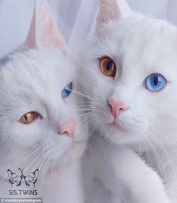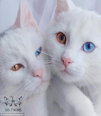 Theo chủ cặp mèo, Iriss và Abyss có bộ lông trắng và đôi mắt loạn sắc một cách hoàn toàn tự nhiên.