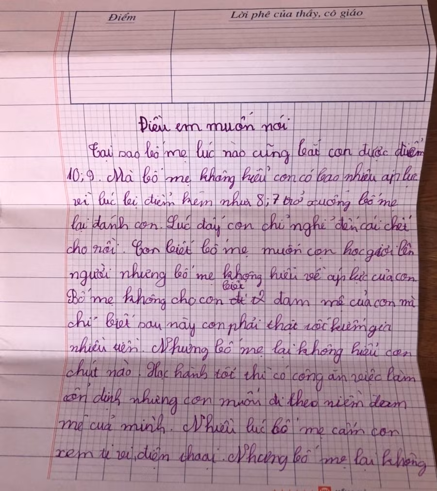“Lúc đấy con chỉ nghĩ đến cái chết… Bố mẹ không cho con biết đam mê của con mà chỉ biết sau này con phải thật tốt, kiếm ra nhiều tiền”, những dòng chia sẻ non nớt của học sinh lớp 4 khiến người lớn không thể không suy ngẫm.
