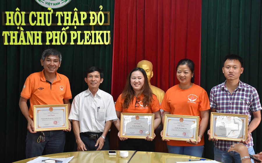 Chủ tịch Hội Chữ thập đỏ TP. Pleiku tặng giấy khen cho các cá nhân có thành tích xuất sắc trong phong trào hiến máu tình nguyện năm 2020. Ảnh: Hà Phương