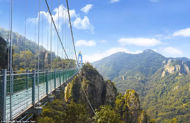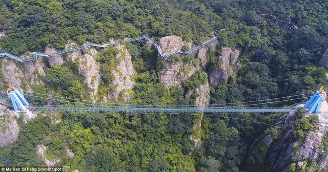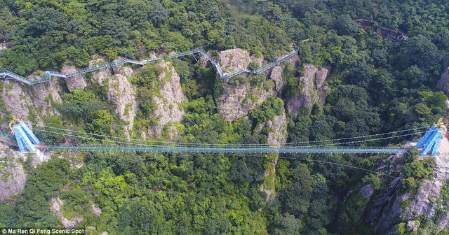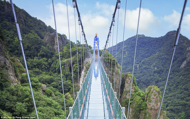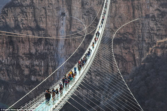 Cầu treo đáy kính dài nhất thế giới ở Trung Quốc với lối đi bộ có mặt kính trong suốt nhìn xuyên thấu xuống vực thẳm dưới chân. Cây cầu chịu được sức nặng tối đa 2000 người cùng lúc, mở cửa đón khách dịp tết Nguyên đán ở Trung Quốc vừa qua.