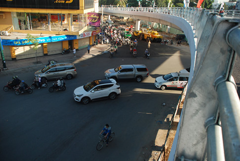 Trong khi đó, dưới chân cầu vượt, phương tiện theo trục Phạm Văn Đồng đổ về khu vực vòng xoay Nguyễn Thái Sơn hướng về đường Tân Sơn Nhất - Bình Lợi - Vành Đai Ngoài và Hoàng Minh Giám tăng cao, tuy nhiên có lực lượng CSGT túc trực phân luồng dưới chân vòng xoay nên xe cộ di chuyển ổn định.