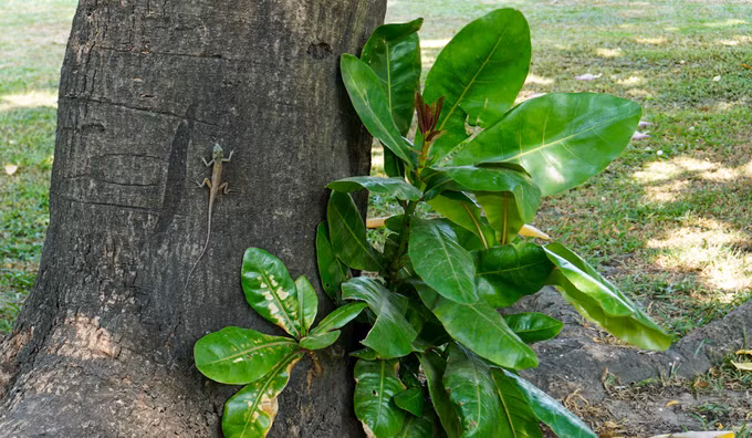 Lá chúng khá giống cây bàng thường với những lá đơn, mọc cách nhau và rụng vào mùa Đông.