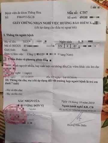 Ngày 28-10, trên mạng xã hội Facebook lan truyền hình ảnh chụp giấy "Chứng nhận nghỉ việc hưởng BHXH" (giấy nghỉ ốm), mang tên Nguyễn Văn V. (SN 1994, giới tính nam) nhưng ở phần chẩn đoán và phương pháp điều trị lại ghi: "kinh nguyệt nhiều, hay xuất hiện và không đều…".