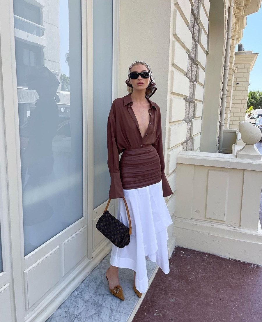 | Nữ siêu mẫu gốc Thụy Điển chọn outfit nâu từ trên xuống dưới bằng bản phối chân váy maxi với áo thun crop top khoe vòng eo con kiến. Sử dụng phụ kiện túi xách, kính mắt tiệp màu trang phục là cách mà cô hoàn thiện tổng thể |