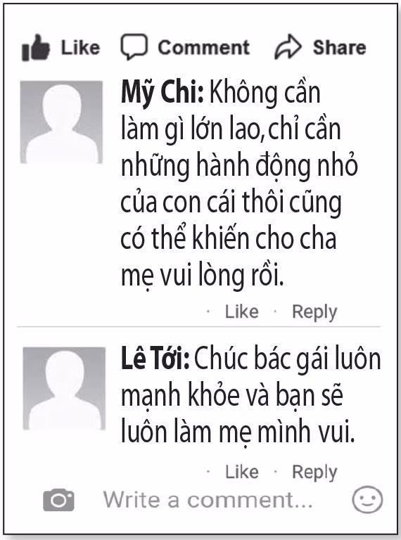 Tài khoản Nguyễn Hoàng Anh Thư bày tỏ: “Đôi khi cảm thấy thương mẹ vì mẹ chưa từng mặc váy cưới. Ba mẹ chưa từng tổ chức đám cưới nhưng vẫn ở bên nhau và nuôi nấng mình đến bây giờ”. Còn tài khoản Hieu Minh Doan thì bình luận: “Dễ thương quá! Bác gái hẳn là rất tự hào vì tấm lòng của người con đã dành cho mẹ”.