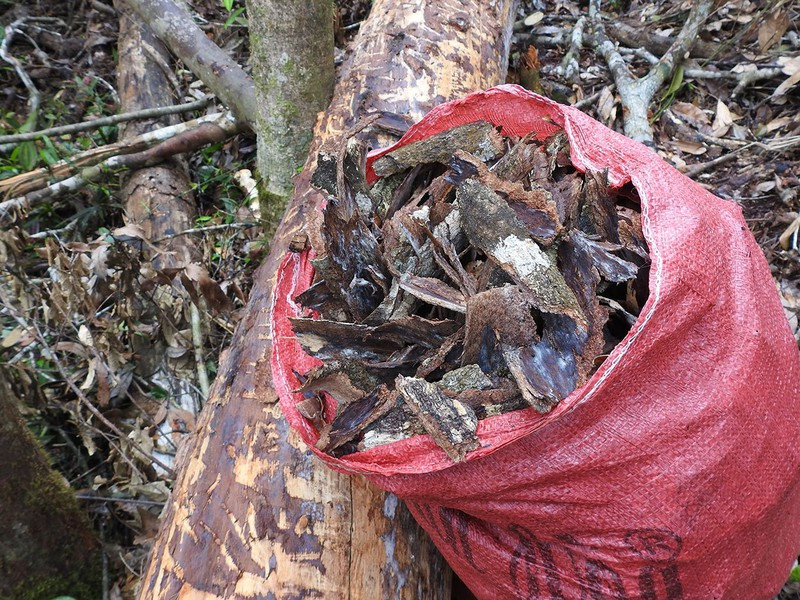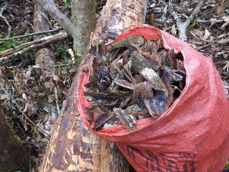 Bao đựng vỏ cây Bùi chưa kịp vận chuyển ra khỏi rừng.