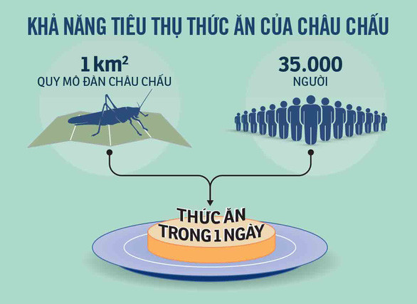 Theo ông Liêm, mỗi con châu chấu sa mạc trưởng thành tiêu thụ bình quân 200mg chất xanh/ngày. Trong khi đó, mật độ phân bố một đàn có thể lên tới 150 triệu con/km2, ước tính một đàn 1km2 có thể tiêu thụ lượng thức ăn 1 ngày tương đương với lượng thức ăn của 35.000 người.