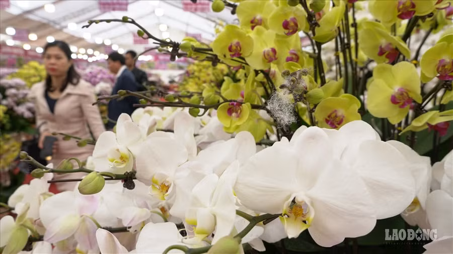 Tại điểm bán hoa Lan Đà Lạt nằm trên phố Lạc Long Quân (Hà Nội), nhiều chậu hoa lan hồ điệp với đủ chủng loại, kích cỡ và màu sắc khác nhau được bày bán để khách hàng vào tham quan và mua hàng.