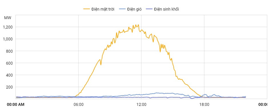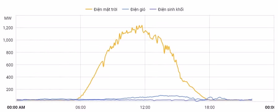 Công suất điện mặt trời biến động rất lớn theo thời gian, cao điểm phát trong khoảng 12 - 13 giờ trưa. Nguồn: EVN