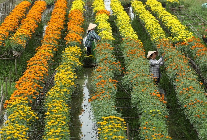 Cách Sài Gòn tầm 140 km, làng hoa Tân Quy Đông ở Sa Đéc là một trong những vựa hoa lớn nhất miền Nam với trăm loại hoa khác nhau trồng trên diện tích hàng chục nghìn m2. Nghề trồng hoa ở đây đã trải qua hơn 100 năm bằng phương pháp đặc trưng, thay vì trồng thành từng luống trên đất thì họ xếp các chậu trên giàn tre, nứa cao hơn mặt đất như kiểu vườn treo. Mùa khô, bạn có thể đi bộ giữa các luống hoa, còn đến mùa nước nổi, vài nơi trong vườn bị ngập khiến nông dân phải chèo xuồng đi chăm hoa.
