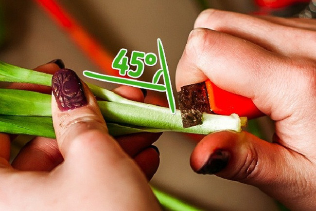 Bạn đừng quên cắt các đầu của thân cây thường xuyên. Sử dụng một con dao sắc nét, và tỉa thân cây ở góc 45º. Cách làm đơn giản này sẽ làm tăng khả năng hấp thụ nước của hoa. Nói chung, bạn cũng cần phải tỉa cành hoa mua trong kho ngay trước khi đưa vào trong nước.