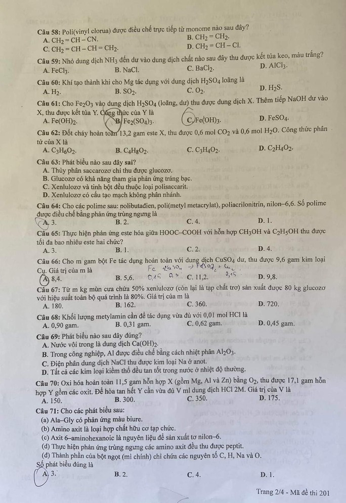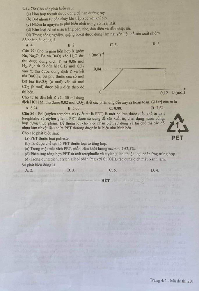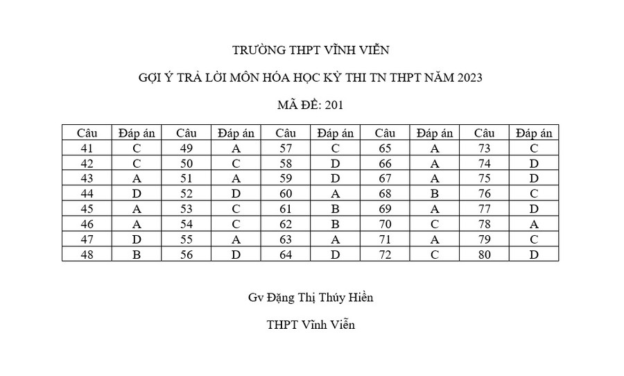 Đáp án môn Hóa học: