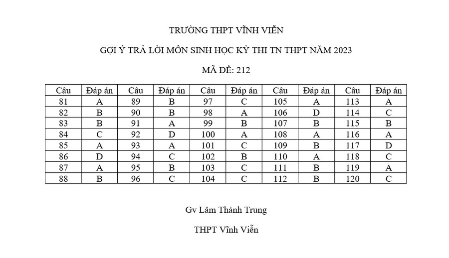 Đáp án môn Sinh học: