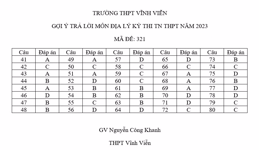Đáp án môn Địa lý:
