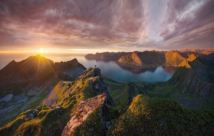 Mặt trời lúc nửa đêm- bức ảnh được nhiếp ảnh gia Daniel Kordan chụp tại núi Husfjellet trên đảo Senja, Na Uy. Nhiếp ảnh gia Kordan chia sẻ, ông rất may mắn khi ghi lại được khoảnh khắc hiếm hoi mặt trời rạng rỡ vào lúc nửa đêm dù Đêm trắng không phải là điều gì quá đặc biệt tại các nước Bắc Âu.