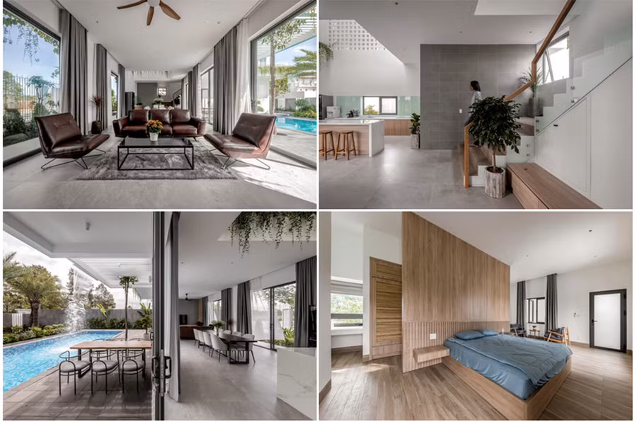 | Khối nhà được thiết kế lùi nhiều so với mặt đường và phát triển theo hình chữ L ôm lấy bể bơi giúp không gian các phòng đều có hướng nhìn ra bể bơi. |