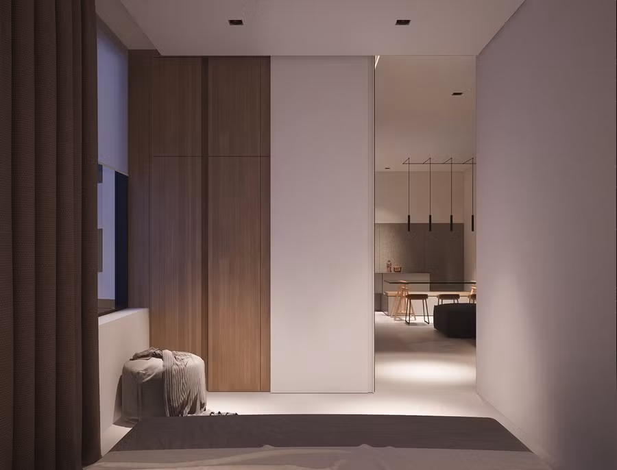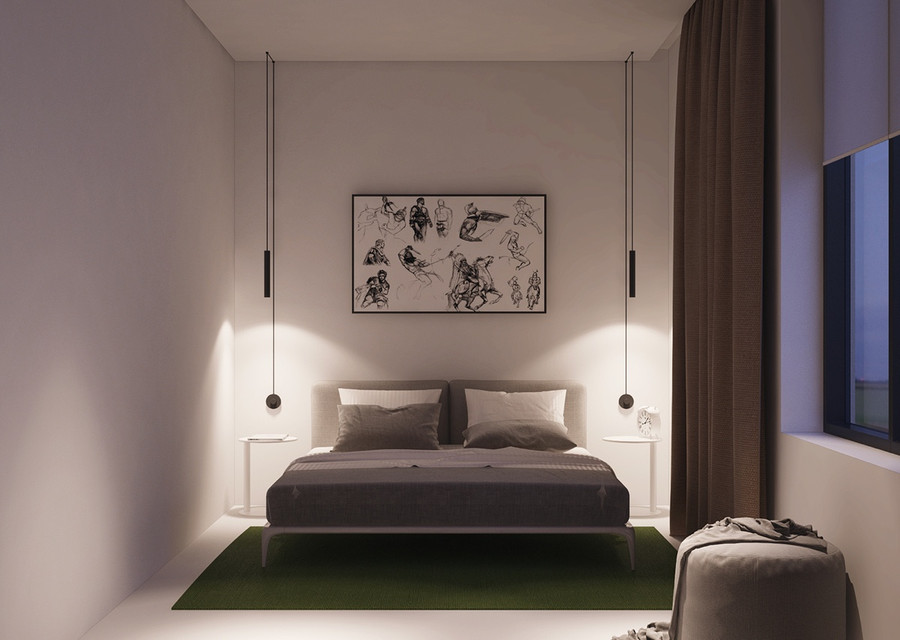 Phòng ngủ theo phong cách tối giản với một chiếc bàn đầu giường đơn giản và hệ thống đèn hiện đại.