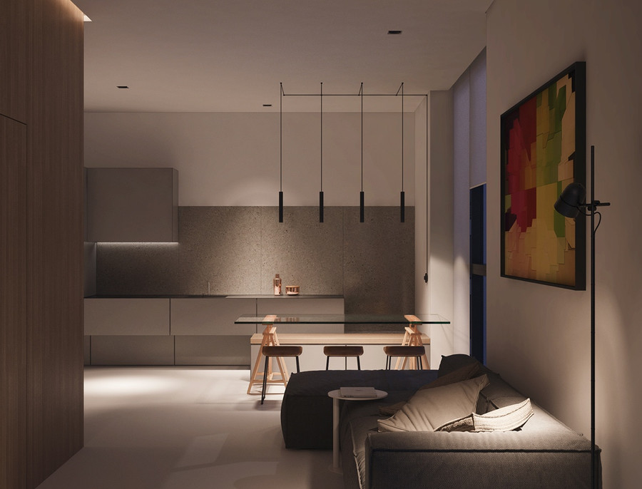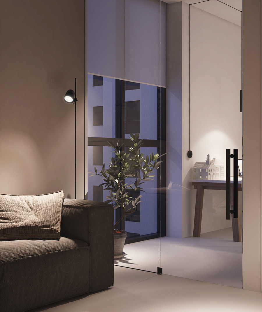 Khu vực phòng khách được tách biệt hẳn với không gian còn lại trong căn hộ bởi một tấm kính đơn giản, giúp mở rộng không gian và mang đến sự sang trọng. Một chậu cây cảnh làm bừng sáng cả căn phòng và rất phù hợp với chiếc đèn cây hiện đại.