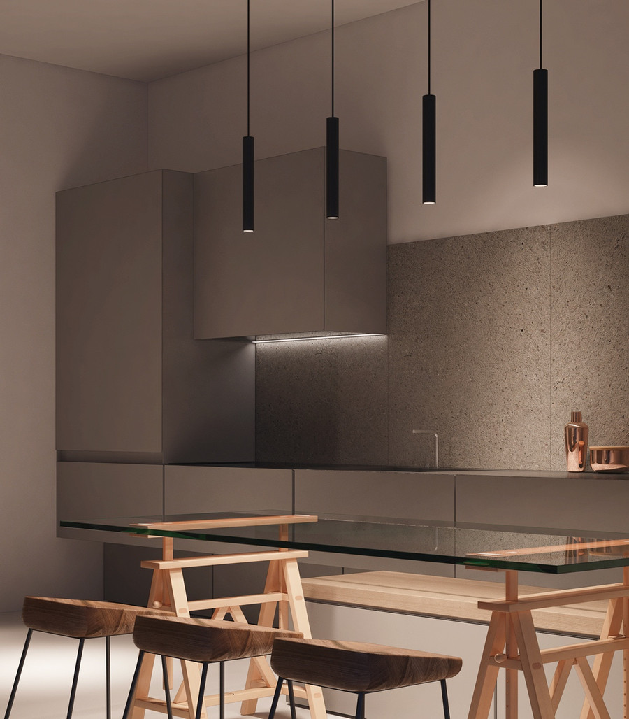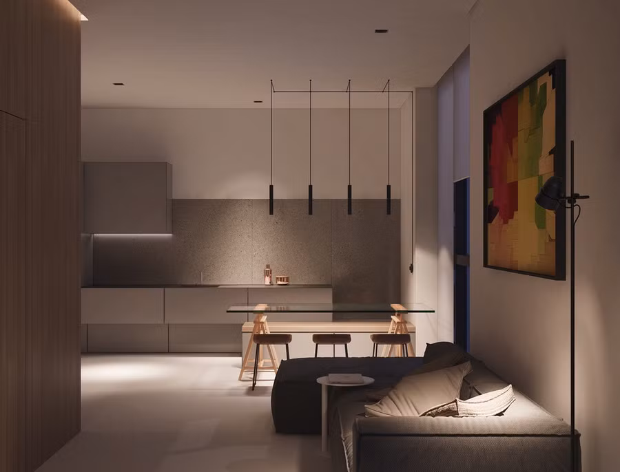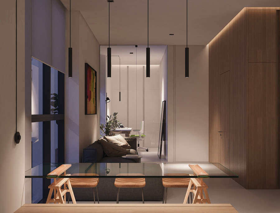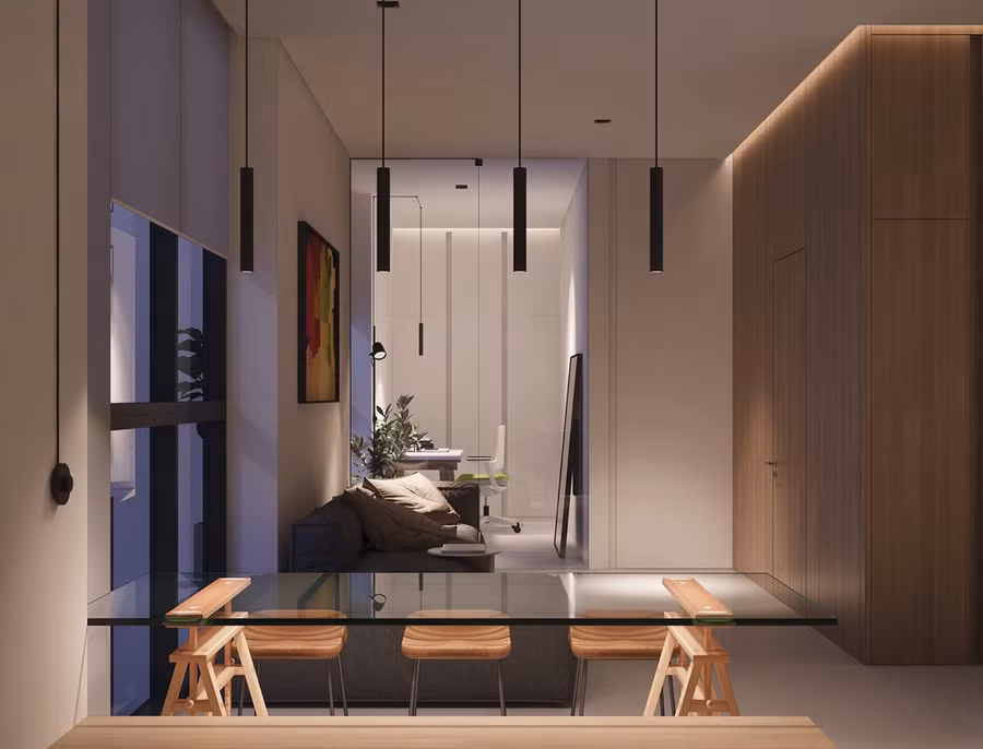 Bước vào căn hộ, bạn sẽ thích thú với chiếc bàn độc đáo, bộ ghế đẩu gỗ và những chiếc đèn trần kiểu cách trong phòng khách không gian mở.