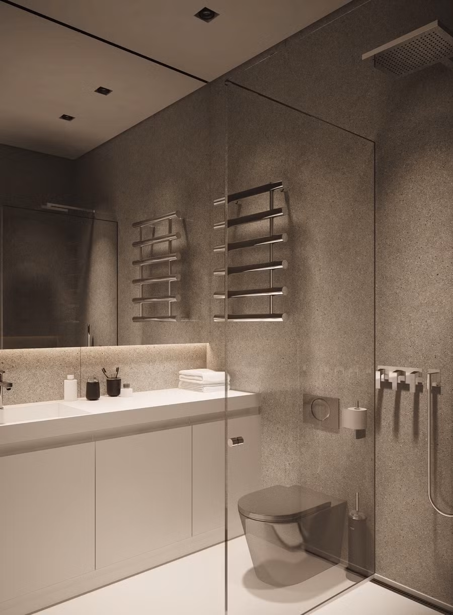 Phòng tắm của căn hộ này có thể là phòng tắm trong mơ của rất nhiều người. Hiện đại, tinh tế và vô cùng sang trọng - tất cả những gì bạn mong muốn ở căn phòng riêng tư nhất trong ngôi nhà.