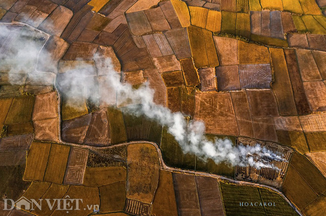 Xa xa, một số cánh đồng đã gặt và bắt đầu đốt rơm rạ ngay trên ruộng.