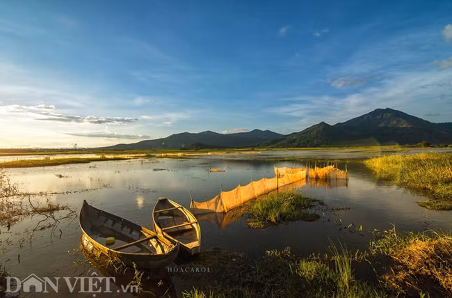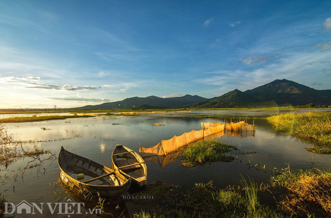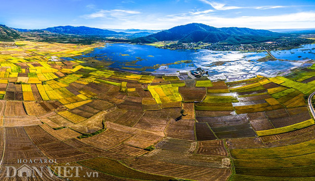 Thời điểm này, cánh đồng trông như một bức tranh nhiều màu sắc; sắc vàng óng của lúa chín hòa quyện với màu xanh của núi rừng, màu xanh da trời in xuống mặt hồ nước phẳng lặng, trong vắt.