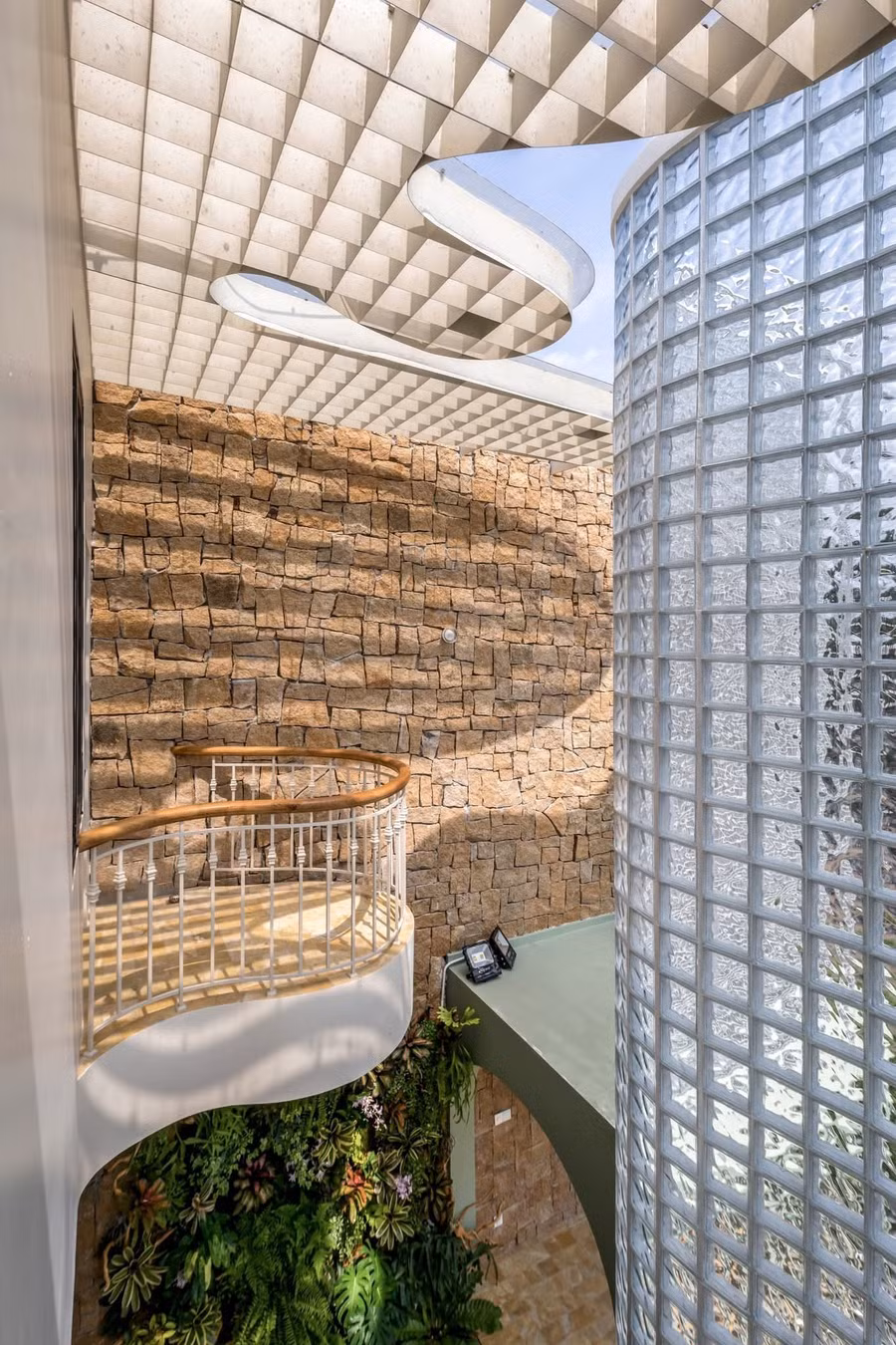 Thiết kế lấy cảm hứng từ kiến trúc hữu cơ (organic architecture), hướng đến sự hòa hợp giữa không gian sống và thiên nhiên. Mặt tiền uốn lượn với hơn 3000 viên gạch kính, cùng các lớp không gian đan xen giúp tối ưu hóa ánh sáng tự nhiên và thông gió, giảm thiểu tiêu thụ năng lượng.