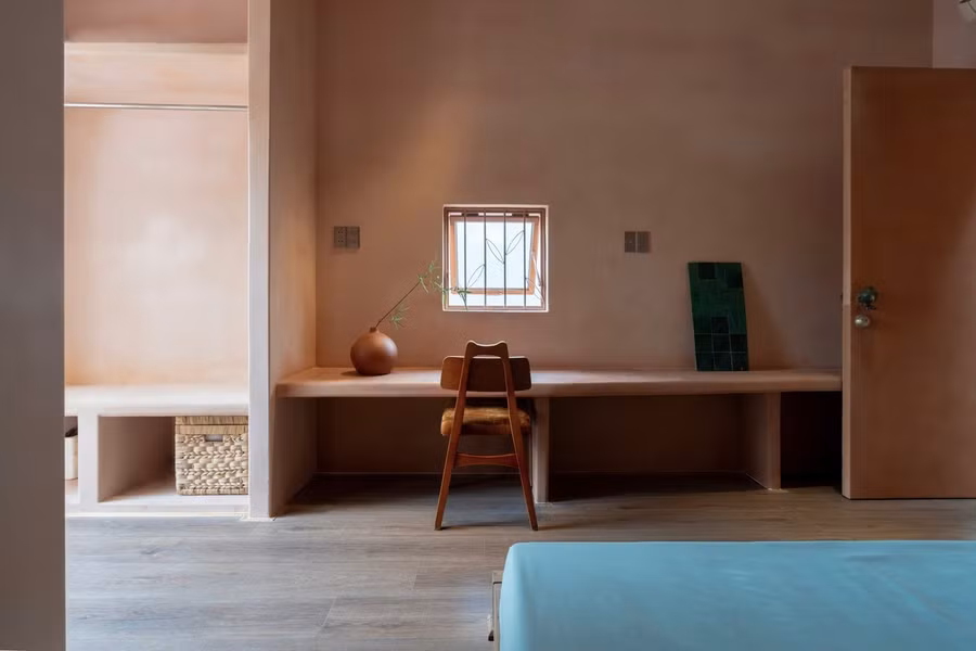Nội thất công trình là những chi tiết thủ công chân thật, mang đậm dấu ấn cá nhân. Chủ nhà đã tự tay chế tác nhiều chi tiết nội thất: một tác phẩm nghệ thuật treo tường họa tiết, một bàn trà với những viên gạch men được sắp xếp tinh tế, một đèn thả trần nhà bếp được điêu khắc tinh xảo, và chân bàn ăn làm từ ống thoát nước. Mỗi vật dụng đều trở thành một cuộc đối thoại với vật liệu và không gian, phản ánh một lối sống ổn định, trân trọng từng khoảnh khắc, thấm đẫm tinh thần táo bạo và sự sáng tạo của chủ nhà.