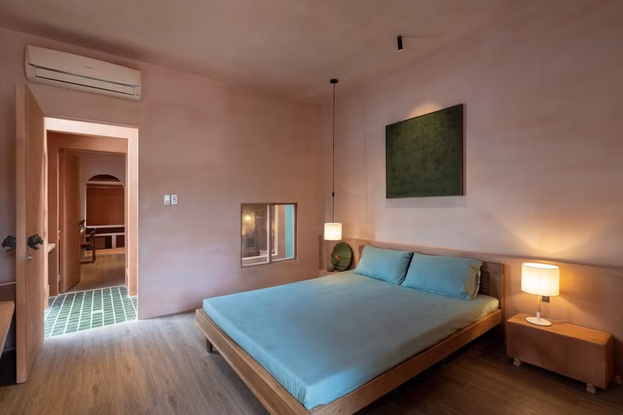 Ngôi nhà là sự giao thoa giữa quá khứ và hiện tại, giữa tay nghề thủ công của con người và bản chất xúc giác của thiên nhiên. Tay nắm cửa bằng gốm hình động vật – cá, rùa, ếch, chim – không chỉ là điểm nhấn trang trí mà còn là những câu chuyện tinh tế về dòng sông, cánh đồng và cảnh quan bản địa. Các song cửa sổ mô phỏng hình dạng của những rặng tre, vừa che chắn vừa chiếu sáng, nhẹ nhàng đưa hình ảnh những hàng tre của một ngôi làng cổ vào không gian sống. Tre cũng là một họa tiết thường thấy, được sử dụng xuyên suốt nội thất và mặt tiền, tạo thành một sợi dây tự nhiên kết nối tiềm thức của cuộc sống nông thôn với không gian kiến trúc.