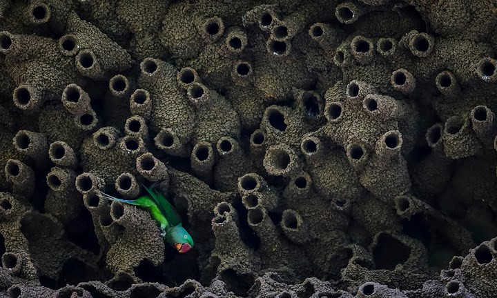 Chú vẹt Alexandrine nép trong một chiếc tổ chim nhạn.